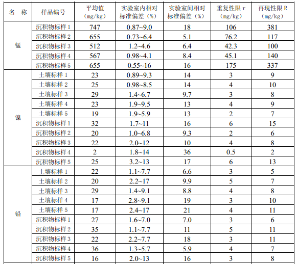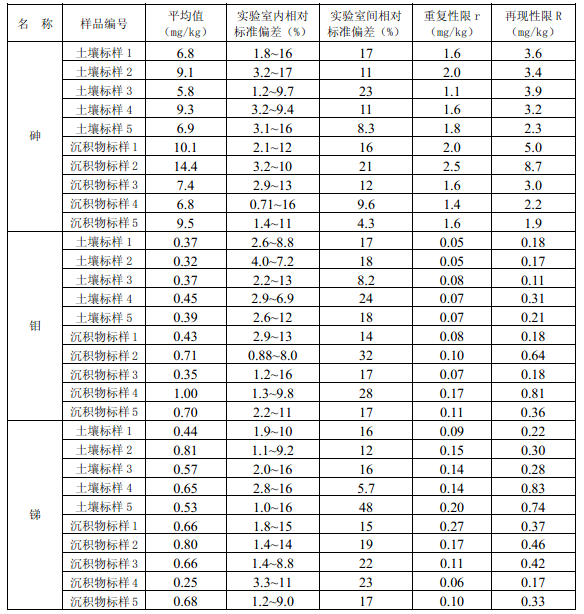 11.3 每批次樣品至少按10%的比例進行平行雙樣測定,樣品數量少于10個時,應至少測定一個平行雙樣。平行雙樣測定結果中,電熱板消解測定鈷(Co)、銅(Cu)、鉻(Cr)、錳(Mn)、鎳(Ni)、鉛(Pb)、鋅(Zn)、釩(V)、砷(As)的相對偏差應小于30%,鎘(Cd)、鉬(Mo)、銻(Sb)的相對偏差應小于40%;微波消解測定12種金屬元素的相對偏差應小于30%。