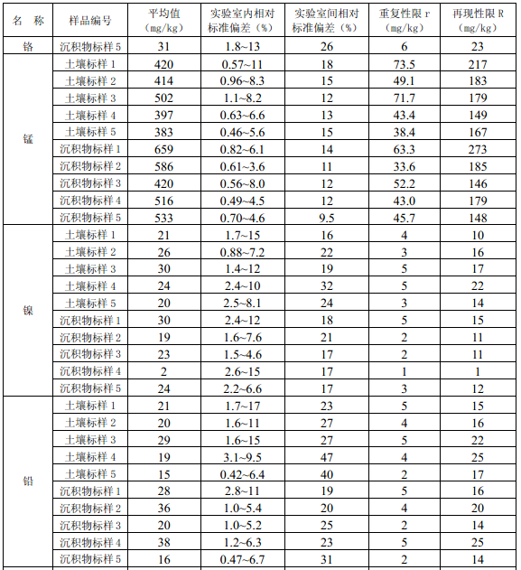 10.1 精密度6家實驗室分別用電熱板消解法和微波消解法對5種不同含量水平的統一標準土壤樣品和沉積物樣品進行測定,電熱板消解法的精密度匯總數據見附錄B中的表B.1,微波消解法的精密度匯總數據見附錄B中的表B.2。