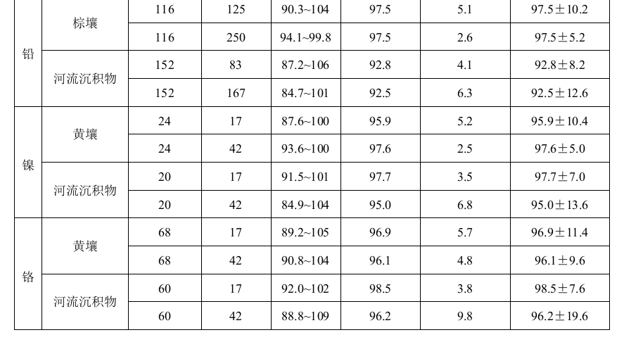 六家實(shí)驗(yàn)室分別對加標(biāo)量為125 mg/kg和250 mg/kg的含鉛為116 mg/kg的棕壤樣品進(jìn)行了6次重復(fù)測定:加標(biāo)回收率范圍分別為90.3%~104%和94.1%~99.8%,加標(biāo)回收率最終值分別為97.5%±10.2%和97.5%±5.2%。六家實(shí)驗(yàn)室分別對加標(biāo)量為83 mg/kg和167 mg/kg 的含鉛為152 mg/kg的河流沉積物樣品進(jìn)行了6次重復(fù)測定:加標(biāo)回收率范圍分別為87.2%~106%和84.7%~101%,加標(biāo)回收率最終值分別為92.8%±8.2%和92.5%±12.6%。