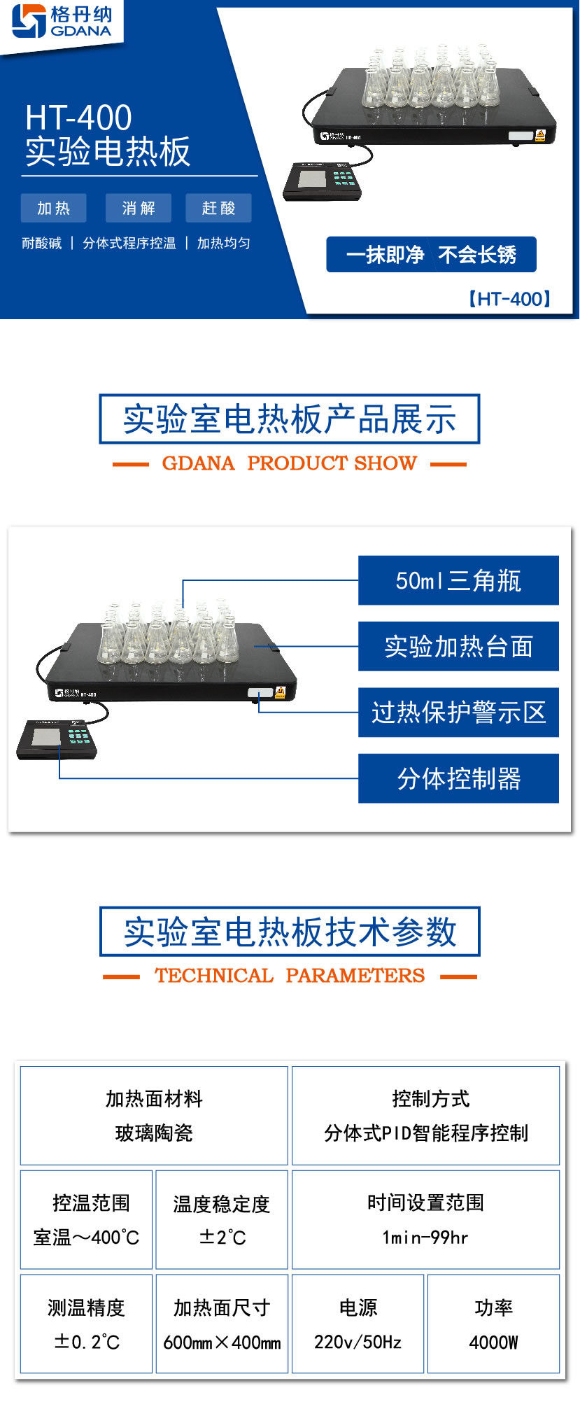 HT-400陶瓷加熱板專用于無機化學元素分析時對各類樣品作加熱、消煮、趕酸用的恒溫加熱裝置。臺面具有耐酸堿,不生銹等特性;分體PID程序數(shù)顯控溫,是實驗室樣品預處理好助手。