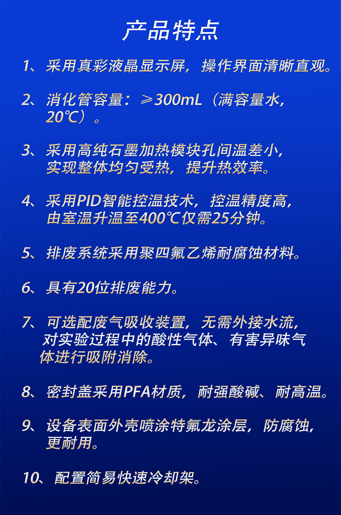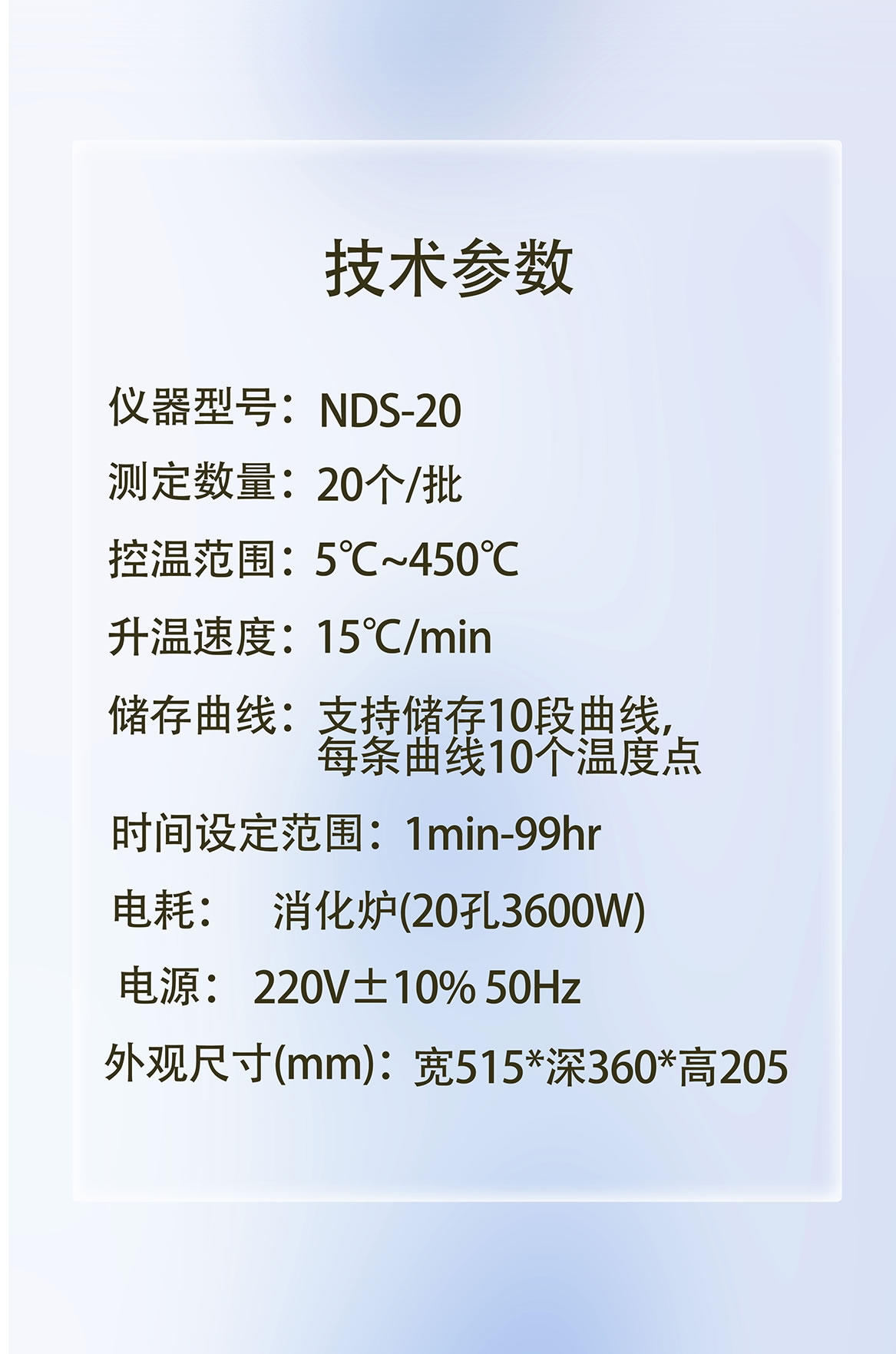 石墨消化爐NDS-20搭配排廢系統(tǒng),采用高精度PID控溫技術(shù)及接觸式加熱石墨塊,適用于實驗室多種樣品的高效消煮。其特殊的抗氧化處理石墨塊和耐腐蝕排廢系統(tǒng),可確保消解過程中溫度的均勻性和排廢氣體的安全處理。該產(chǎn)品操作簡便、功能完善,廣泛應(yīng)用于環(huán)境、農(nóng)業(yè)、食品等多個行業(yè)的樣品前處理工作。