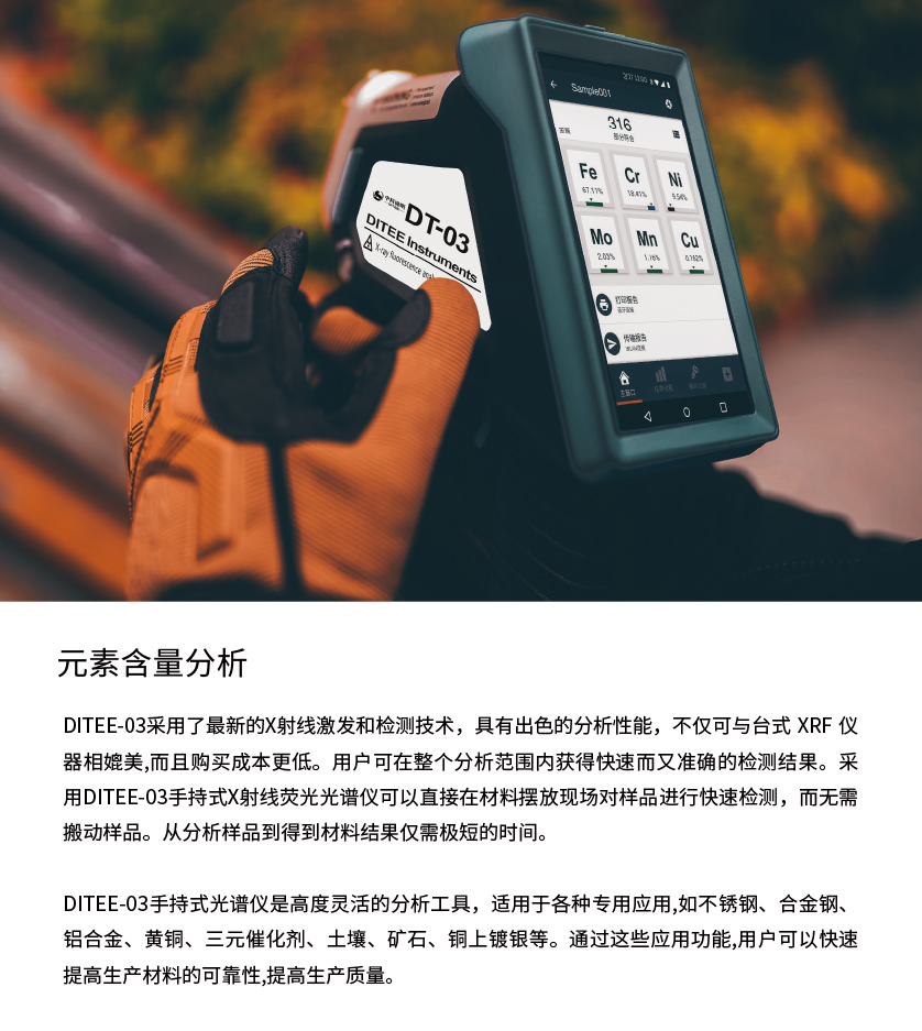 DITEE-03手持式光譜儀是一款基于X射線與物質之間熒光作用的手持式光譜儀,主要用于檢測材料中的元素含量。這款手持式光譜儀可用于快速檢測不銹鋼、中低合金鋼、工具鋼、模具鋼、黃銅、純銅、青銅、鋁合金、三元催化鉑鈀銠、金銀鉑貴金屬、土壤、礦石、油品等金屬、粉末、液體材料。