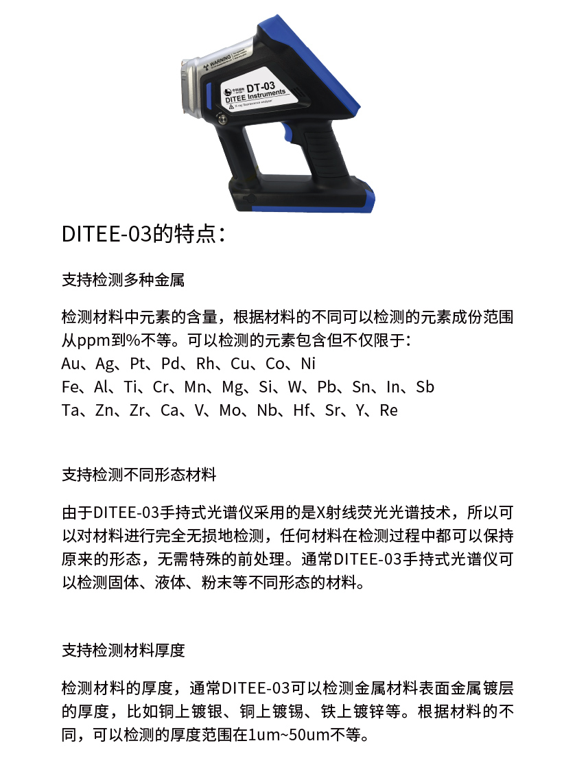 由于DITEE-03手持式光譜儀采用的是X射線熒光光譜技術,所以可以對材料進行完全無損地檢測,任何材料在檢測過程中都可以保持原來的形態,無需特殊的前處理。通常DITEE-03手持式光譜儀可以檢測固體、液體、粉末等不同形態的材料。