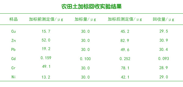 同時對農(nóng)田土進行加標實驗,平行加標3份,加標回收率進行測定,結(jié)果如下表。