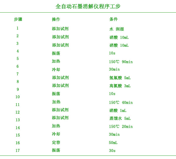 準確稱取0.5g(精確至0.0001g)試樣于全自動石墨消解儀特氟龍消解管內(nèi),并置放到全自動消解儀石墨孔中,進行編號。用少量水潤濕后,加入硝酸和鹽酸各10mL,振搖10s,在150℃溫度下加熱90min;冷卻30min后,加入5mL氫氟酸和3mL高氯酸,振搖10s,在150℃溫度下加熱40min;再加入1mL硝酸和5mL蒸餾水,在150℃溫度下繼續(xù)加熱20min;冷卻30min,用蒸餾水定容至50mL,振搖30s。全自動石墨消解儀程序消解步驟如下: