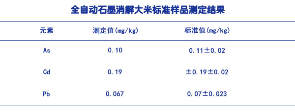 采用全自動石墨消解儀消解完后,在優化的測試條件下對每份試樣溶液平行測定2次,取2次測定的平均值作為測試結果,并與標準物質的含量進行比較(見表:全自動石墨消解大米標準樣品測定結果)。從測試結果可以看出大米標 準物質As、Cd、Pb的含量均在隹直的范圍內。說明以上消解方式可行。