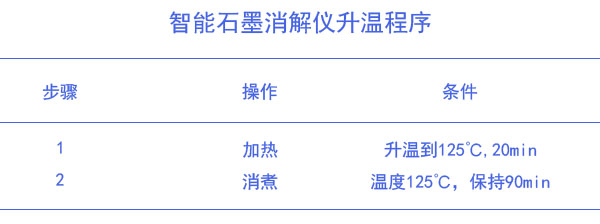 準(zhǔn)確量取0.25g(過(guò)100目篩)土壤樣品于50mL聚四氟乙烯消解管中,加入1mL硝酸溶液、1mL鹽酸溶液及2mL氫氟酸于消解儀中,同時(shí)蓋上蓋子,置于智能石墨消解儀的石墨孔中加熱消解,通過(guò)無(wú)線遠(yuǎn)程平板上的APP預(yù)先設(shè)置程序進(jìn)行消解(消解程序見下列表)。消解樣品程透明狀態(tài),開蓋,稍冷,然后定容至50mL。將得到的澄清液稀釋10倍作為液體樣品,待上機(jī)測(cè)定。同時(shí)做空白樣品試驗(yàn)。