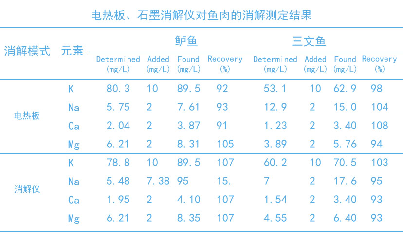 電熱板濕法全消解、石墨消解儀半消解對樣品前處理方法對鱸魚和三文魚進行分析,結果表明上述消解方法均具有較好的精密度和準確度。其中的石墨消解儀消解方法能夠更加有效、快速、綠色地測定魚肉中常見的幾種營養元素。