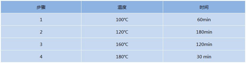 稱取0.2g(精確至0.1mg)樣品于聚四氟解管中,用少量水潤濕;加入5ml鹽酸。打開平板啟動設(shè)置好的程序開始加熱(消解程序下如表),100℃消解保持60min;加5ml硝酸、5ml氫氟酸、1ml高氯酸,加蓋,120℃消解保持180min;開蓋,160℃消解保持120min;最后溫度提高到180℃趕酸,當加熱至冒濃厚高氯酸白煙時,加蓋,待消解管壁上的黑色有機物消失后,開蓋,驅(qū)趕白煙并蒸至內(nèi)容物呈不流動狀態(tài)的液珠狀。用1%硝酸溫熱溶解可溶性殘渣,轉(zhuǎn)移至25ml容量瓶中定容,搖勻,待測。同時做空白樣品。